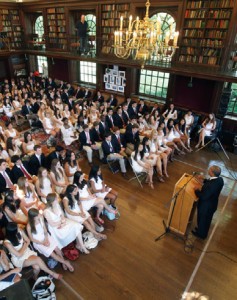 Graduation is rich with traditions and rituals— formal and informal. For instance, the longstanding practice of electing the student speakers assures seniors that at their last Milton gathering, they will hear messages from classmates they chose. More recently, Class I students have been inviting accomplished Milton alumni to be commencement keynote speakers. This year, Massachusetts Governor Deval Patrick, Class of 1974, talked with graduates in Straus Library, prior to the formal commencement ceremony.
